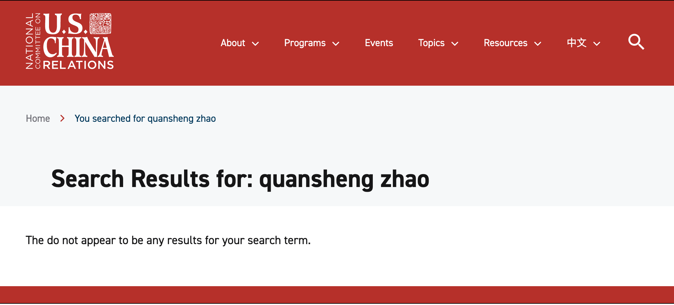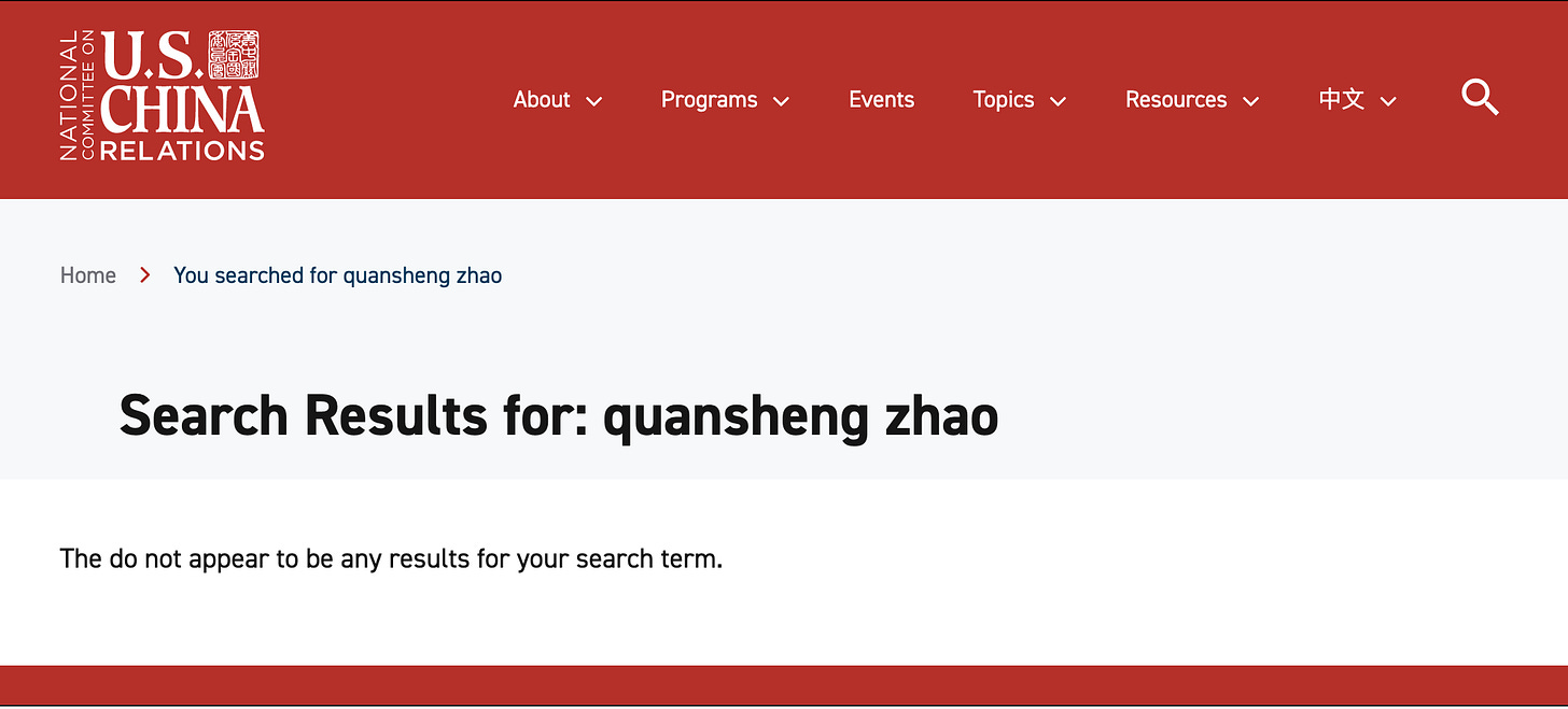 According to Zhao’s bio, he’s a member of the National Committee on US-China Relations (NCUSCR). Surprisingly, a search for Zhao’s name on the NCUSCR website yields zero results.